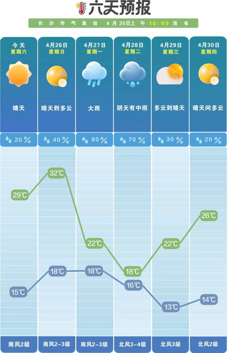 根据长沙市气象台最新预报,明日(4月26日)长沙依然维持晴天到多云的好天气,气温18℃至32℃,南风2到3级,适合出门遛弯、洗晒。但请注意:明天晚上开始,天气将迎来明显转折。